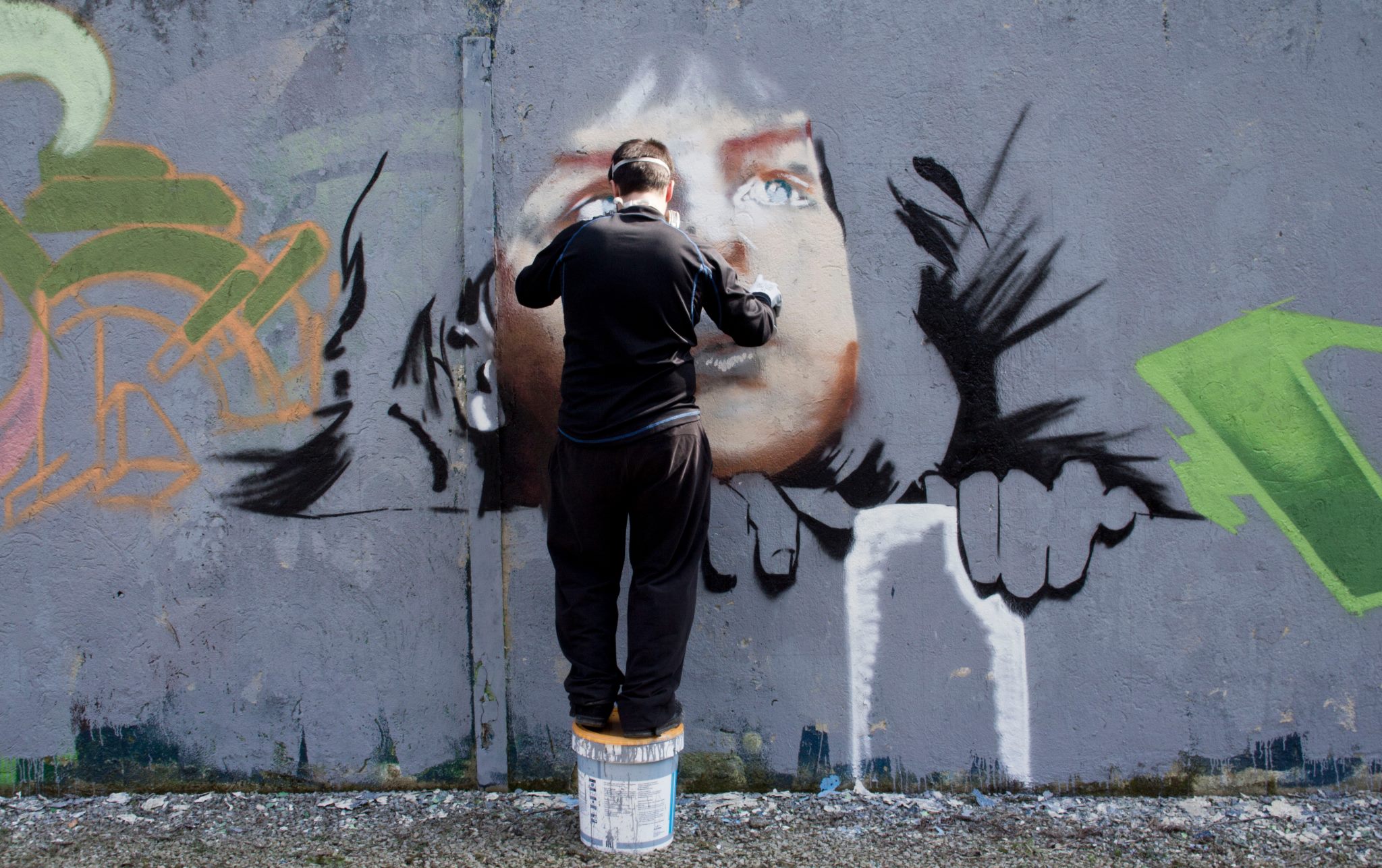 Grafiteruek Astra alboko horman, bonbardaketari buruzko irudixek eitten.